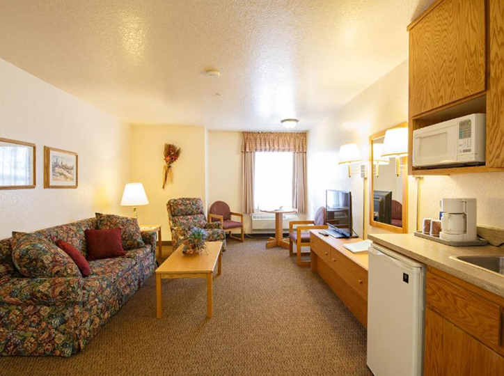Our Mini Suite is one upstairs extra large room with a king bed, rocking chair, plus all standard amenities.