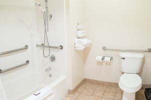 Accessible Double Queen Room is 300 sq. ft. Features include a low peep hole, door bell and strobe light. TTY set available in the Lobby. Accessible in room bathroom is 50 sq. ft. and equip with an ADA toilet with grab bars behind and along side, tub shower combination with seat, adjustable shower head and grab bars.